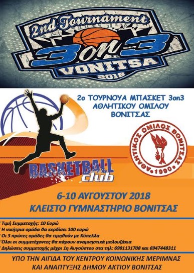 Για δεύτερη συνεχόμενη χρονιά το Κέντρο Κοινωνικής Μέριμνας και Ανάπτυξης Δήμου Ακτίου Βόνιτσας σε συνεργασία με το Δ.Σ. του Αθλητικού Ομίλου Βόνιτσας, διοργανώνει τουρνουά 3 on 3 μπάσκετ για όλους και όλες στο Κλειστό Γυμναστήριο της πόλης μας.