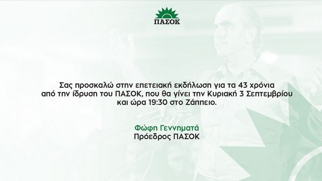 Ιδιαίτερο ενδιαφέρον αποκτά η εκδήλωση για τα 43 χρόνια από την ίδρυση του ΠΑΣΟΚ, που θα πραγματοποιηθεί στο Ζάππειο στις 3 Σεπτεμβρίου, καθώς προηγείται της εκλογής αρχηγού του νέου φορέα της κεντροαριστεράς τον Οκτώβριο.