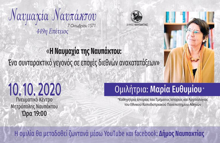 Ταυτόχρονα, έχουμε την τιμή να φιλοξενούμε το Σάββατο, 10 Οκτωβρίου 2020, την Ακαδημαϊκό-Ιστορικό κ. Μαρία Ευθυμίου, η οποία θα πραγματοποιήσει ομιλία με θέμα: «Η Ναυμαχία της Ναυπάκτου: Ένα συνταρακτικό γεγονός σε καιρούς διεθνών ανακατατάξεων». Η ομιλία θα μεταδοθεί ζωντανά (live streaming) από το Πνευματικό Κέντρο της Μητρόπολης Ναυπάκτου μέσα από τις επίσημες σελίδες YouTube και Facebook: Δήμος Ναυπακτίας. Ώρα έναρξης: 19:00.