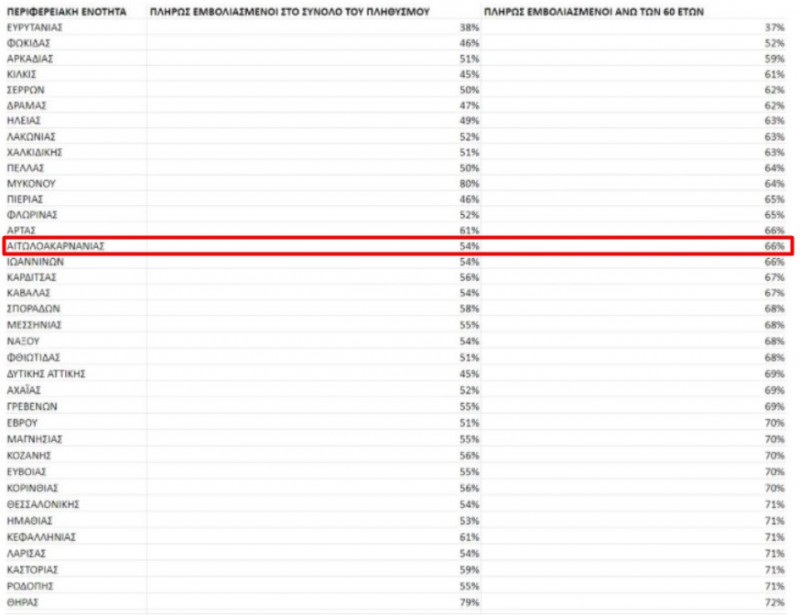 Σε 68 από τις 74 Περιφερειακές Ενότητες της χώρας, σύμφωνα με τον χάρτη που δημοσιεύει ο Ελεύθερος Τύπος της Κυριακής βρίσκεται σε ποσοστά κάτω του 70% στον γενικό πληθυσμό. Αν και η εικόνα είναι καλύτερη στους πολίτες ηλικίας άνω των 60 ετών, 24 Περιφερειακές Ενότητες βρίσκονται κάτω από το φράγμα του 70%, με την Ευρυτανία να είναι καθηλωμένη στο 37%. Ακολουθούν η Φωκίδα με 52% και η Αρκαδία με 59%.
