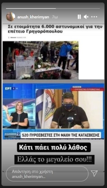 Ειδικότερα, η κοπέλα, που διακρίθηκε στο MasterChef 5 ανήρτησε μία φωτογραφία με δύο διαφορετικούς τίτλους ειδήσεων. Ο πρώτος έγραφε «Σε ετοιμότητα 6.000 αστυνομικοί για την επέτειο Γρηγορόπουλο» και ο δεύτερος «520 πυροσβέστες στη μάχη της κατάσβεσης». Ο συγκεκριμένος συνδυασμός εξόργισε την Ανούς Χεριμιάν, η οποία ξέσπασε.