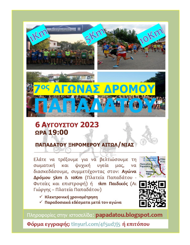 Ο Πολιτιστικός Σύλλογος Παπαδαταίων «Ο Άγιος Νικόλαος» διοργανώνει με την υποστήριξη του Ν.Π.Δ.Δ. Πολιτισμός – Περιβάλλον και Αθλητισμός, Παιδεία και Κοινωνική Πρόνοια στο Δήμο Ξηρομέρου και του Τοπικού Συμβουλίου Παπαδάτου τον 7ο Aγώνα Δρόμου στην Παπαδάτου Ξηρομέρου την Κυριακή 06/08/2023 και ώρα 19:00.
