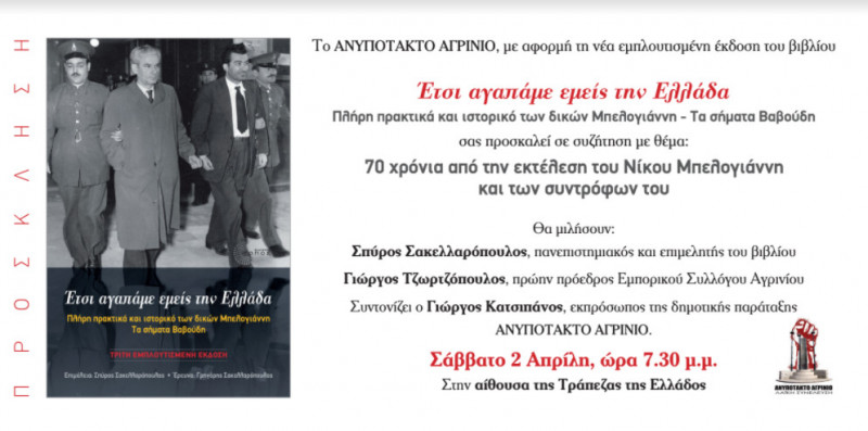 Η Δημοτική Παράταξη Ανυπότακτο Αγρίνιο με αφορμή τη νέα εμπλουτισμένη έκδοση του βιβλίου του Σπύρου Σακελλαρόπουλου «Έτσι αγαπάμε εμείς την Ελλάδα πλήρη πρακτικά και ιστορικό των δικών Μπελογιάννη – Τα σήματα Βαβούδη» προσκαλεί σε ανοιχτή συζήτηση με θέμα