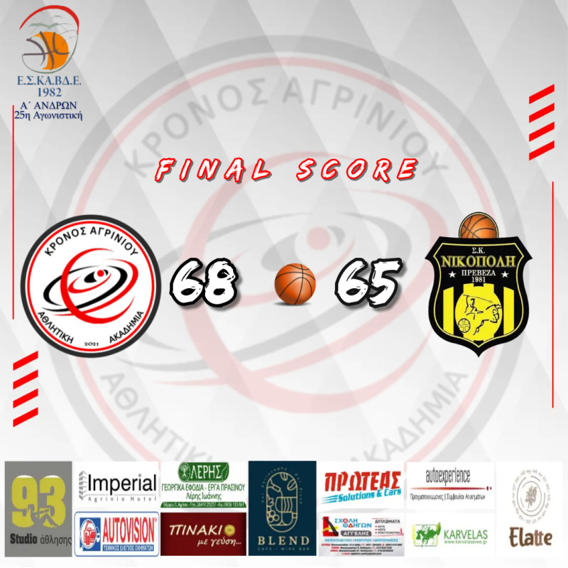 Ένα καταπληκτικό παιχνίδι διεξήχθη στο Δ.Α.Κ. Αγρινίου, εκεί όπου ο Κρόνος Αγρινίου επικράτησε με 68-65 της Νικόπολης Πρέβεζας.
