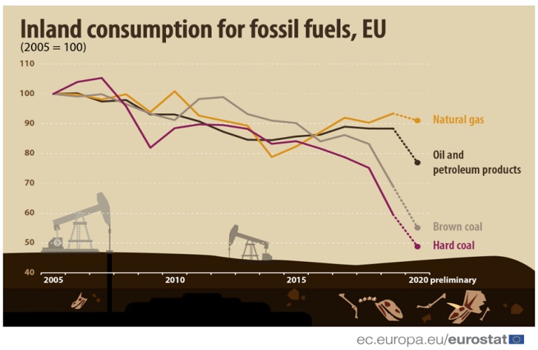 - Τα προκαταρκτικά στοιχεία του 2020 δείχνουν, επίσης, σημαντική μείωση στην ΕΕ εσωτερικής κατανάλωσης ορυκτών καυσίμων.