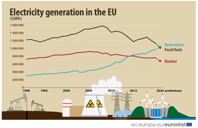 Παρόμοια τάση παρατηρήθηκε για την παραγωγή ηλεκτρικής ενέργειας από πυρηνικά, όπου τα προσωρινά δεδομένα για το 2020 δείχνουν το χαμηλότερο σημείο από το 1990, στα 683 183 GWh (6,3% χαμηλότερα από το 1990).