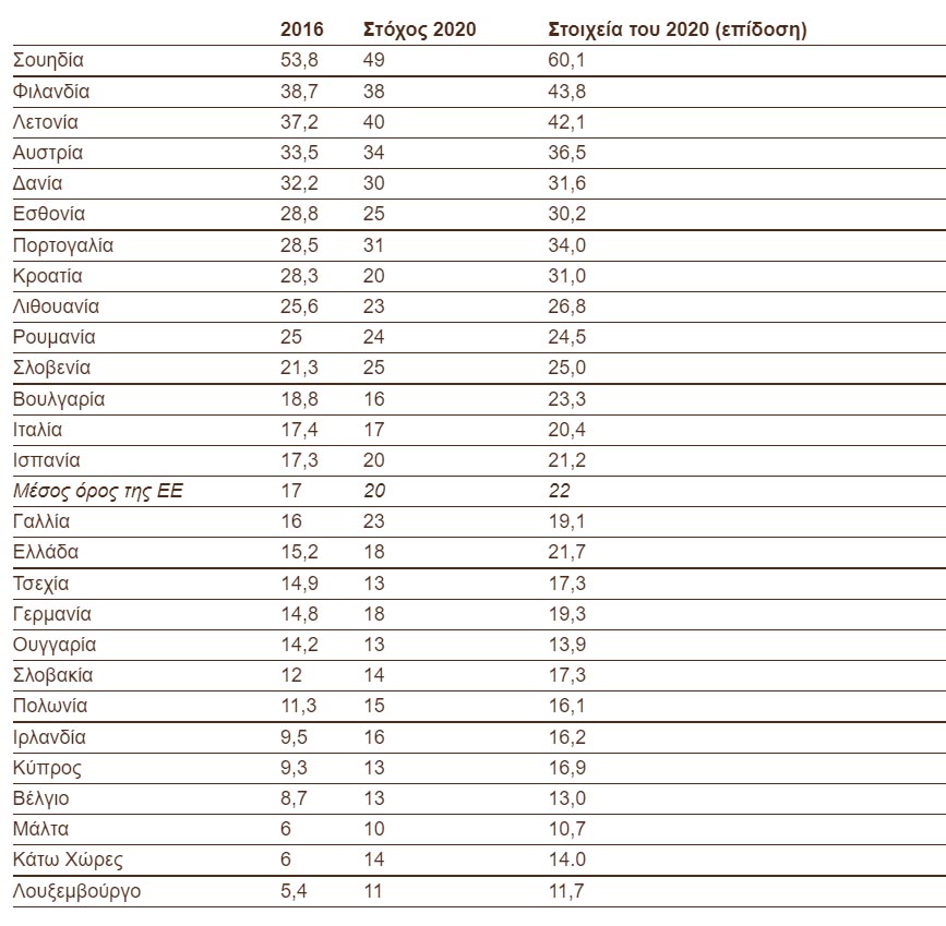 Ο πίνακας, με στοιχεία της Eurostat, δείχνει πώς τα κράτη μέλη πέτυχαν τους στόχους του 2020 όσον αφορά τις ανανεώσιμες πηγές ενέργειας.