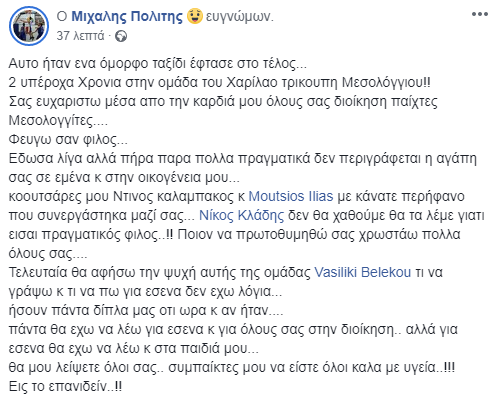 Με ένα μακροσκελές κείμενο στον προσωπικό του λογαριασμό στο facebook τα ξημερώματα της Κυριακής, 23 Ιουνίου ο Μιχάλης Πολίτης αποκάλυψε πως αποχωρεί από την ομάδα του Χαρίλαου Τρικούπη.