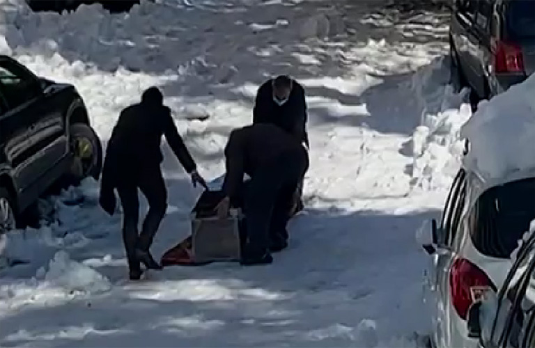 Μάλιστα, οι τρεις που προσπαθούν να μεταφέρουν το άτομο που έφυγε από τη ζωή, φαίνεται να δυσκολεύονται αρκετά λόγω του πάγου.
