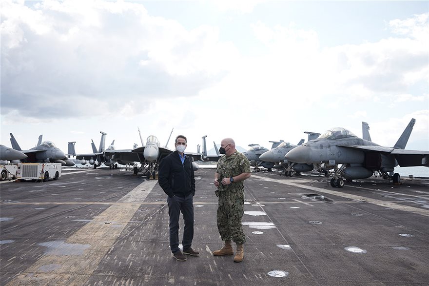 Στη συνέχεια, ο Πρωθυπουργός περπάτησε στο κατάστρωμα και στον διάδρομο απονήωσης και προσνήωσης, όπου βρίσκονταν «παρατεταγμένα» μαχητικά αεροπλάνα F/A-18. Ενημερώθηκε για τις επιχειρησιακές δυνατότητες του αεροπλανοφόρου, τον οπλισμό του και τους μηχανισμούς που διαθέτει για την ασφαλή απονήωση και προσνήωση αεροσκαφών που κινούνται με εξαιρετικά μεγάλες ταχύτητες. Σημειώθηκε επίσης η εξαιρετική συνεργασία ανάμεσα στις ένοπλες δυνάμεις της Ελλάδας και των ΗΠΑ, με κορωνίδα τη Σούδα, για την προάσπιση κοινών αξιών και συμφερόντων στην ευρύτερη περιοχή.