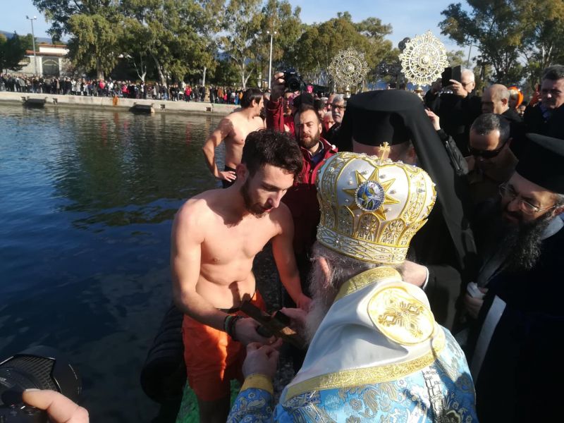Με λαμπρότητα εορτάσθηκαν σήμερα στην Ιερή Πόλη του Μεσολογγίου τα Άγια Θεοφάνεια. Στον Μητροπολιτικό Ναό του Αγίου Σπυρίδωνος, χοροστατούντος του Σεβ. Μητροπολίτου Αιτωλίας και Ακαρνανίας κ. Κοσμά το πρωί τελέσθηκε Θεία Λειτουργία και η Ακολουθία του Μεγάλου Αγιασμού των Θεοφανείων. Με σχηματισμό πομπής συνοδεία Αγήματος του 2/39 Συντάγματος Ευζώνων και της Φιλαρμονικής του Δήμου Ι.Π. Μεσολογγίου, ο Τίμιος Σταυρός αμέσως μετά μεταφέρθηκε στο Λιμάνι του Μεσολογγίου, όπου κι έγινε η καθιερωμένη Κατάδυση κι ο Αγιασμός των υδάτων. Παρά τη χαμηλή θερμοκρασία που επικρατούσε, το παραδοσιακό έθιμο της κατάδυσης τηρήθηκε και φέτος, με τους κολυμβητές να λαμβάνουν την ευλογία του Σεβασμιότατου Μητροπολίτη Αιτωλίας και Ακαρνανίας κ. Κοσμά.