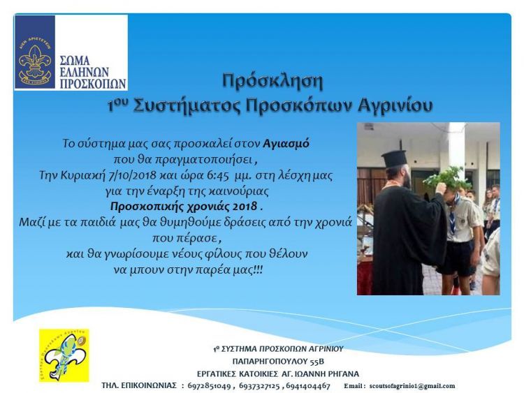 Την ερχόμενη Κυριακή, 07 Οκτωβρίου και ώρα 6:45 μ.μ. στη λέσχη η έναρξη της καινούργιας Προσκοπικής χρονιάς 2018 από το 1ο Σύστημα Προσκόπων Αγρινίου. Μαζί με τα παιδιά θα θυμηθούν δράσεις της περσινής περιόδου και θα γνωρίσουν νέους φίλους που θέλουν να μπουν σε αυτή την παρέα.