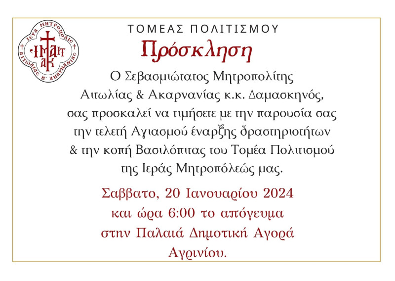 Το Σάββατο, 20 Ιανουαρίου 2024 και ώρα 18:00, στην Παλαιά Δημοτική Αγορά του Αγρινίου, ο Σεβασμιόατος Μητροπολίτης Αιτωλίας και Ακαρνανίας κ.κ. Δαμασκηνός θα τελέσει την Ακολουθία του Αγιασμού για την έναρξη των δραστηριοτήτων και θα ευλογήσει την πρωτοχρονιάτικη πίτα, παρουσία των τοπικών Αρχών, των υπευθύνων, των μελών και των φίλων του Τομέα Πολιτισμού της Ιεράς Μητροπόλεως.