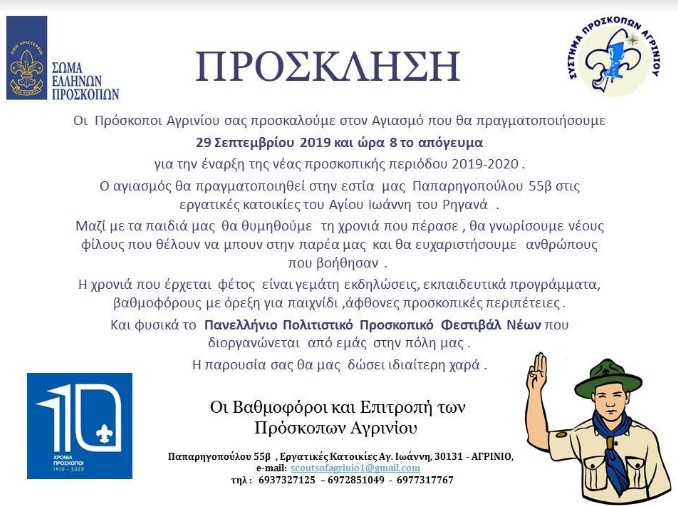 Οι Πρόσκοποι Αγρινίου προσκαλούν στον Αγιασμό που θα πραγματοποιηθεί την Κυριακή, 29 Σεπτεμβρίου 2019 και ώρα 8 το απόγευμα για την έναρξη της νέας προσκοπικής περιόδου 2019-2020.