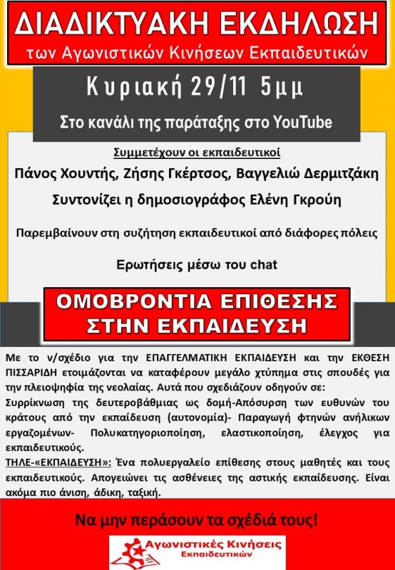 Μπροστά στις εξελίξεις στο χώρο της εκπαίδευσης, οι Αγωνιστικές Κινήσεις Εκπαιδευτικών διοργανώνουν διαδικτυακή εκδήλωση στο κανάλι τους, την Κυριακή 29/11/2020 στις 17.00 το απόγευμα.