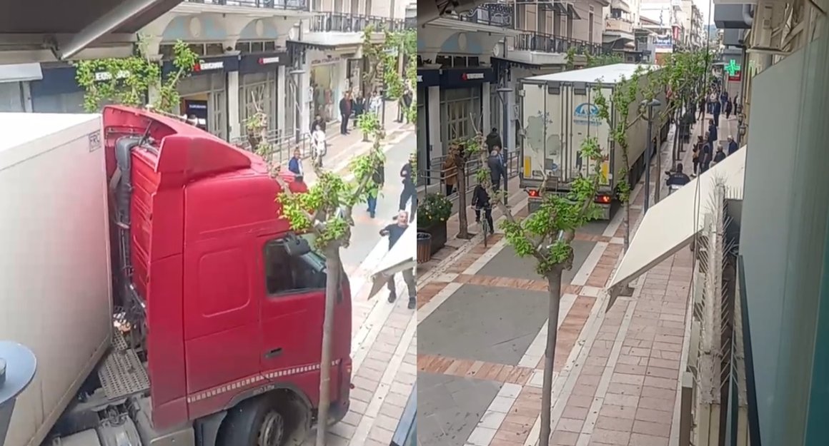 Αναγνώστες ανέφεραν στα Social Media πως το φορτηγό κινούνταν επί της Οδού Σταΐκου και η Τροχαία το οδήγησε στον Πεζόδρομο της Παπαστράτου προκειμένου να βγει από το κέντρο της πόλης και να φθάσει στην Εθνική Οδό.