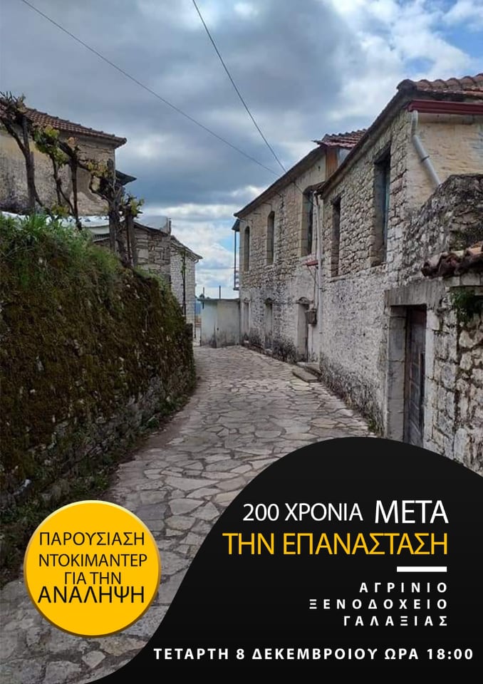 Την Τετάρτη 8 Δεκεμβρίου 2021 και ώρα 18:00 μ. μ. στο Ξενοδοχείο «Galaxias» θα γίνει η πρώτη παρουσίαση ντοκιμαντέρ με θέμα «Ανάληψη… 200 χρόνια μετά την Επανάσταση».