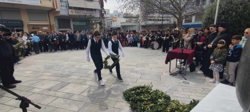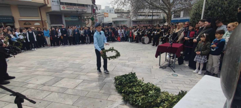 Επιμνημόσυνη δέηση και κατάθεση στεφάνων από μαθητές των Σχολείων της Πρωτοβάθμιας και Δευτεροβάθμιας Εκπαίδευσης, τη Σχολή Αδελφών Νοσοκόμων, εκπροσώπους φορέων κλπ. πραγματοποιήθηκε πριν από λίγο στο μνημείο των πεσόντων στην Πλατεία Δημάδη, στο Αγρίνιο, ενόψει της επετείου της 25ης Μαρτίου 1821.