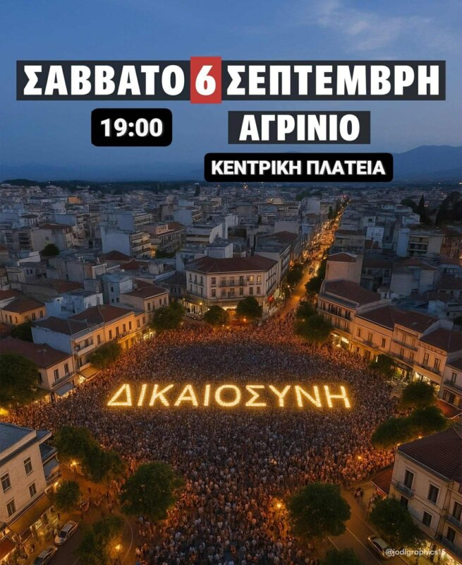 Στο Αγρίνιο, η κινητοποίηση θα πραγματοποιηθεί το Σάββατο, 6 Σεπτεμβρίου 2025, στις 19:00, στην Κεντρική Πλατεία της πόλης. Πρόκειται για μια συμβολική πρωτοβουλία, που χρονικά συμπίπτει με την ομιλία του πρωθυπουργού στη Διεθνή Έκθεση Θεσσαλονίκης.