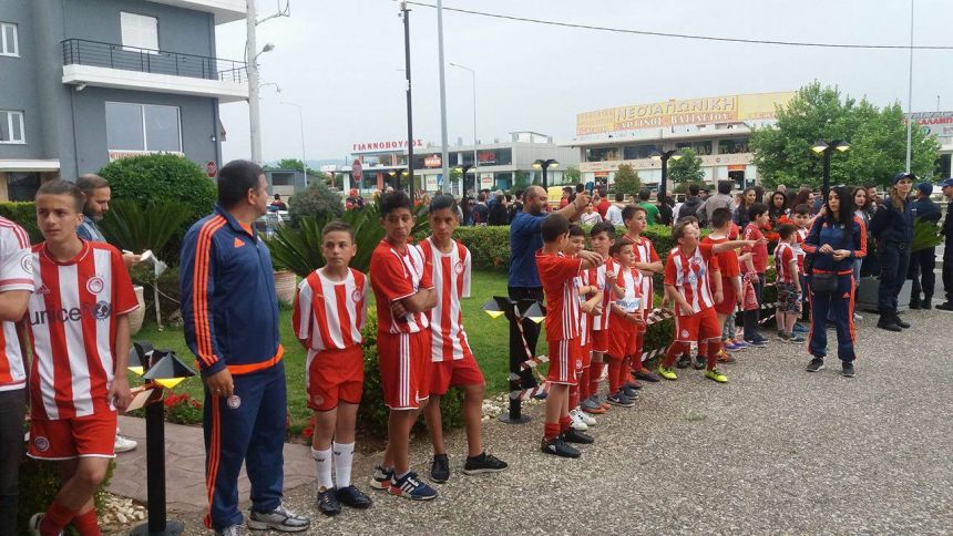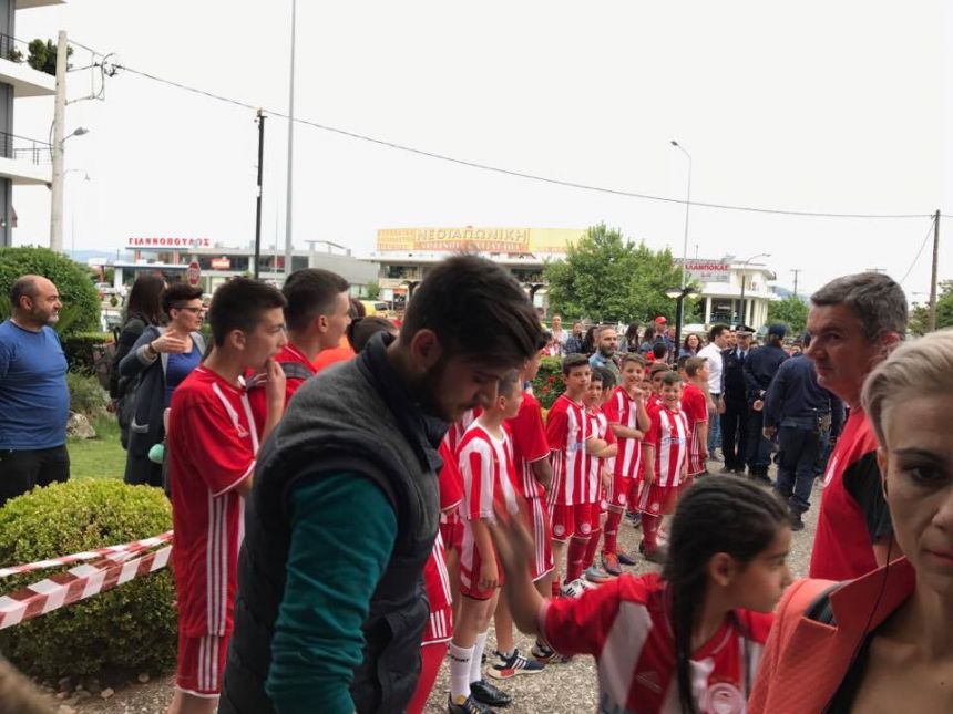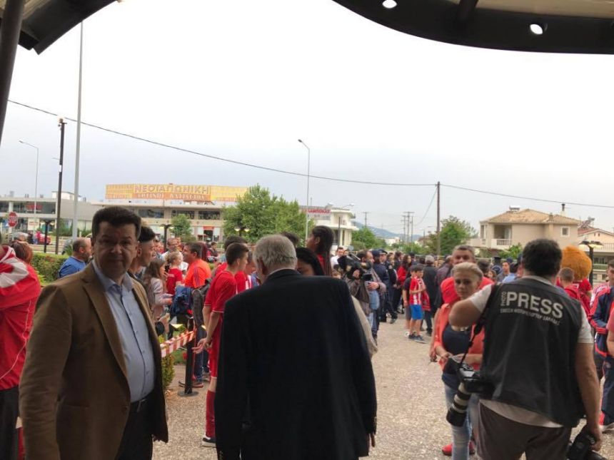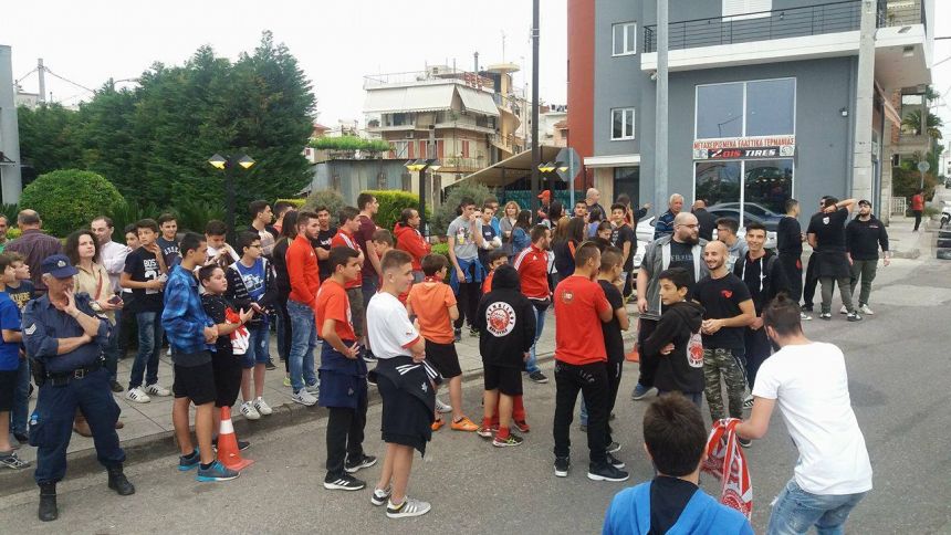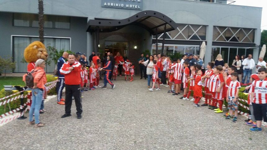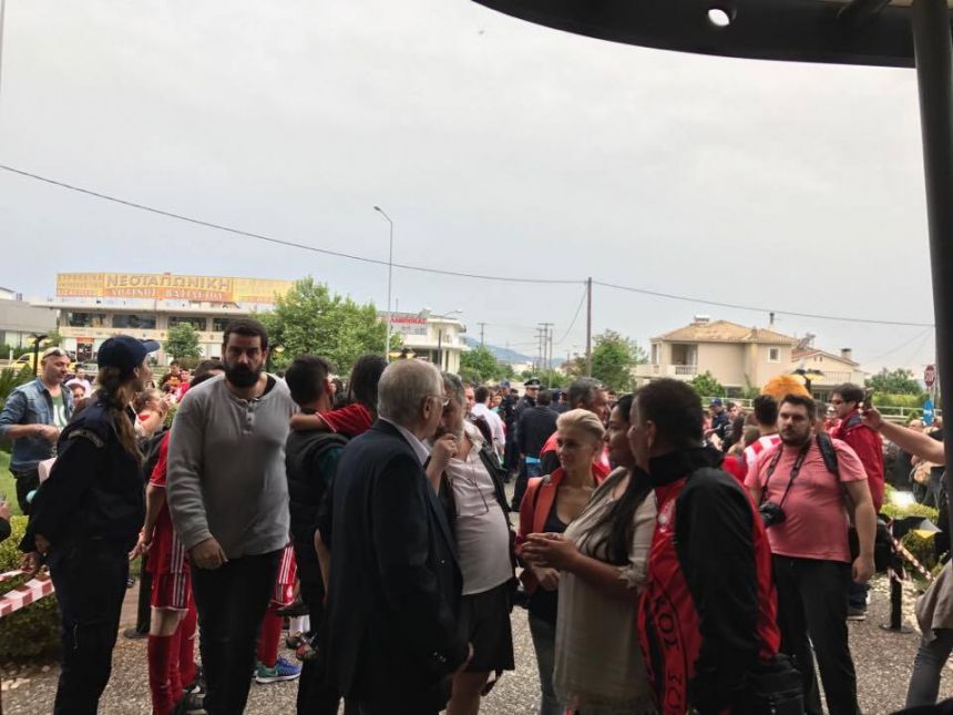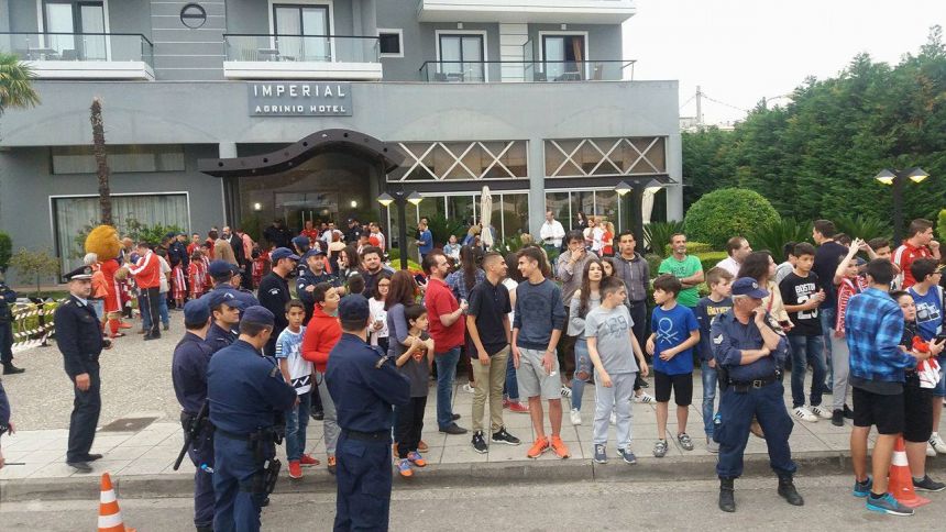Λίγα λεπτά μετά τις 19:30 το πούλμαν με την αποστολή των πρωταθλητών Ελλάδας, υποδέχθηκαν έξω από το ξενοδοχείο που θα διαμείνουν παίχτες και τεχνικό τιμ οπαδοί και φίλαθλοι των «ερυθρολεύκων» λέγοντας το χαρακτηριστικό σύνθημα ”Να τοι, να τοι οι πρωταθλητές” ενώ δεν έλειψαν και οι φωνές εκείνες που ζητούσαν τη νίκη στον αυριανό τελευταίο αγώνα της σεζόν, με αντίπαλο τον Παναιτωλικό.