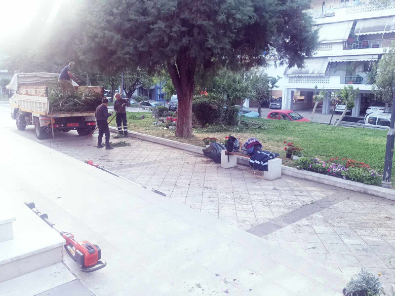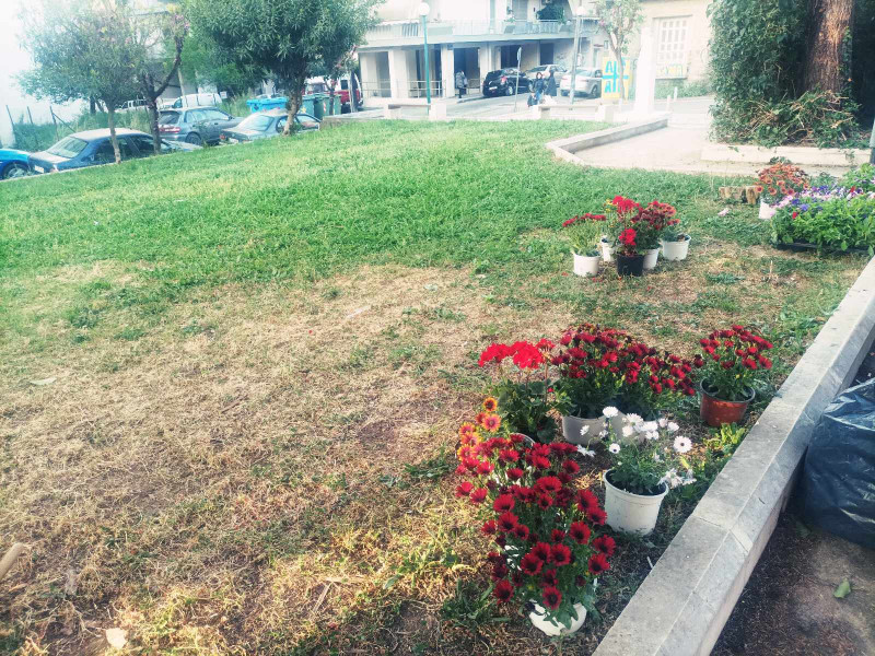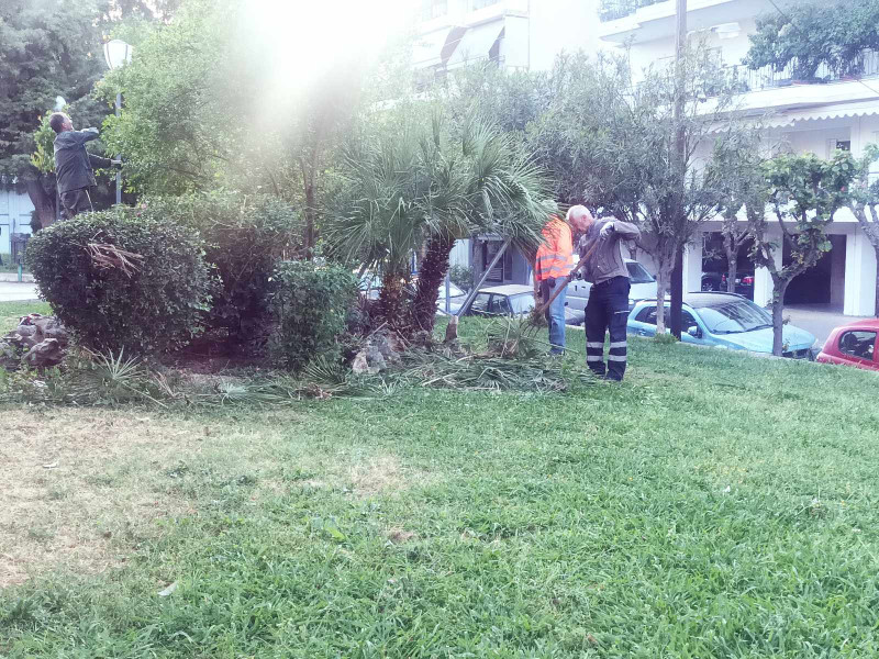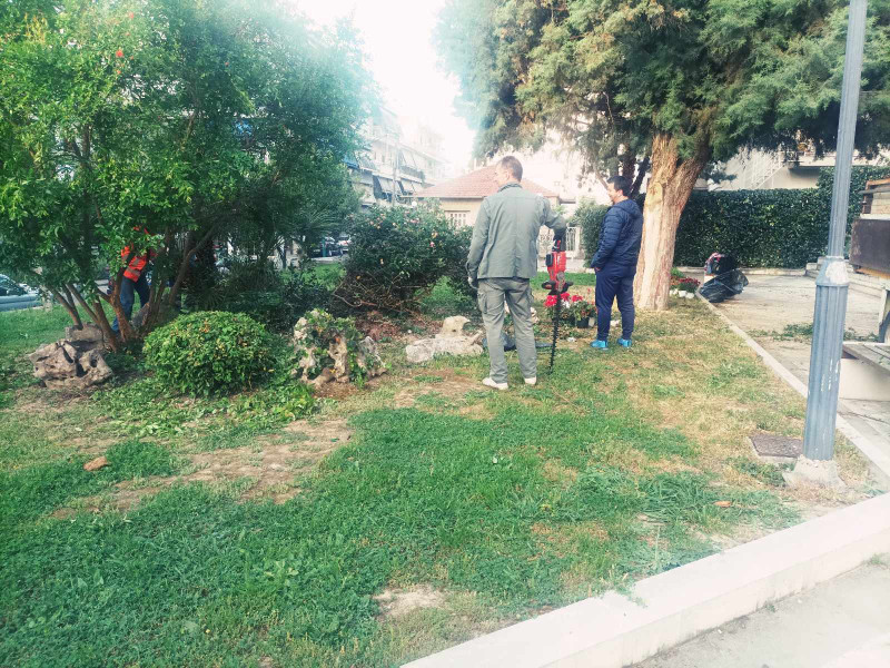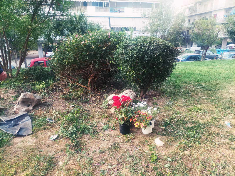 Καθαρίζεται ο χώρος, απομακρύνονται ξερά κλαδιά, καθαρίζονται τα υπάρχοντα φυτά ενώ θα φυτευτούν λουλούδια σε διάφορα σημεία γύρω από τα δέντρα.
