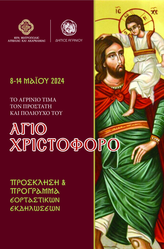 Η Ιερά Μητρόπολη Αιτωλίας και Ακαρνανίας και ο Δήμος Αγρινίου προσκαλούν θερμά όλους τους πολίτες και τους προσκυνητές να λάβουν μέρος στις εορταστικές εκδηλώσεις προς τιμήν του Αγίου Χριστοφόρου, τιμώντας έτσι τον προστάτη και πολιούχο της πόλης.