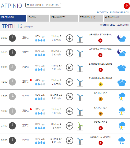 Την Τρίτη 16 Ιουλίου 2019 αναμένονται βροχές και καταιγίδες στη Θεσσαλία και την Κεντρική και Δυτική Μακεδονία που από τις πρωινές ώρες θα επεκταθούν στα υπόλοιπα ηπειρωτικά, το Ιόνιο, τις Σποράδες και την Εύβοια.