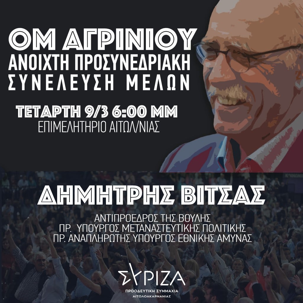 Ο Αντιπρόεδρος της Βουλής και πρώην Υπουργός του ΣΥ.ΡΙΖ.Α. – Π.Σ. Δημήτρης Βίτσας την Τετάρτη 9/3 στις 6:00 μ.μ. θα μιλήσει στο Αγρίνιο στην αίθουσα του Επιμελητηρίου Αιτωλοακαρνανίας στο πλαίσιο ανοιχτής προσυνεδιακής συνέλευσης μελών της Ο.Μ. Αγρινίου του ΣΥ.ΡΙΖ.Α. – Π.Σ.