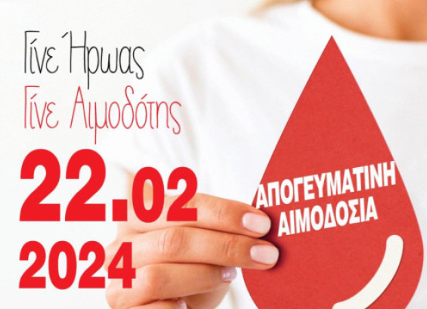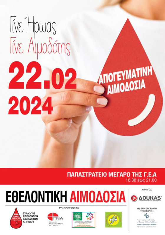 Ο Σύλλογος Εθελοντών Αιμοδοτών Αγρινίου, το Γενικό Νοσοκομείο Αγρινίου, η Ακτίνα Εθελοντισμού του Δήμου Αγρινίου και το Σύστημα Προσκόπων Αγρινίου οργανώνουν Απογευματινή Εθελοντική Αιμοδοσία την Πέμπτη, 22 Φεβρουαρίου 2024 από τις 16:30 έως και τις 21:00 στο Παπαστράτειο Μέγαρο της Γυμναστικής Εταιρείας Αγρινίου.