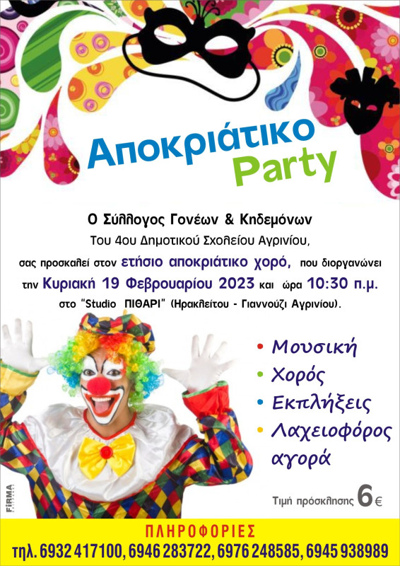 Ο Σύλλογος Γονέων και Κηδεμόνων του 4ου Δημοτικού Σχολείου Αγρινίου, σας προσκαλεί στον Ετήσιο Αποκριάτικο Χορό που διοργανώνει την Κυριακή, 19 Φεβρουαρίου 2023 και ώρα 10:30 π.μ. στο Studio «Πιθάρι» (Ηρακλείτου – Γιαννούζι Αγρινίου).