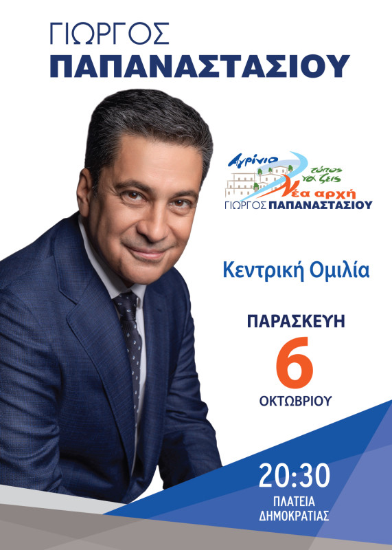 Στις 8:30 μ.μ. ο Επικεφαλής του Συνδυασμού «Αγρίνιο -Νέα Αρχή- Τόπος να Ζεις» θα πραγματοποιήσει την κεντρική ομιλία του: