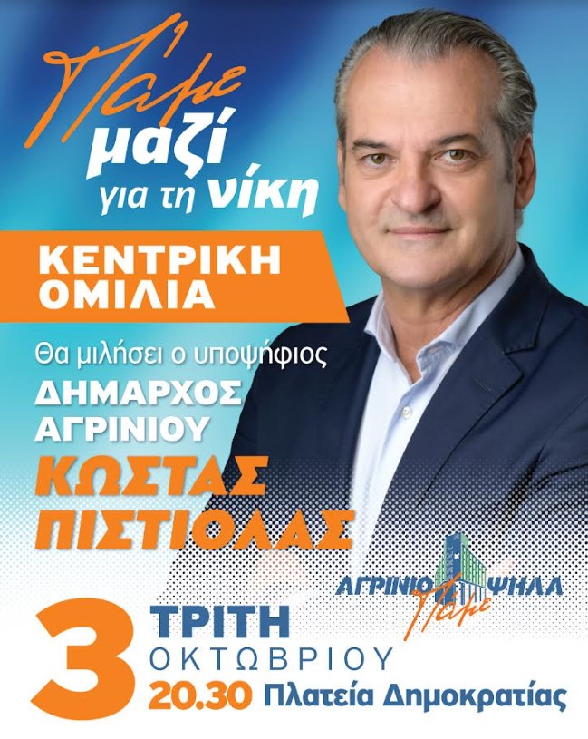 Δυο βδομάδες μετά τη μεγάλη συγκέντρωση για τη διπλή εκδήλωση για τα εγκαίνια του Εκλογικού Κέντρου και την παρουσίαση των υποψήφιων του Συνδυασμού, ο Κώστας Πιστιόλας θα απευθυνθεί στους πολίτες του Αγρινίου, με κεντρικό σύνθημα «πάμε μαζί για τη νίκη», εν όψει της κάλπης της ερχόμενης Κυριακής, 8 Οκτωβρίου.