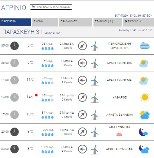 Πιο αναλυτικά, την Παρασκευή 31 Ιανουαρίου 2020 σε ολόκληρη τη χώρα ο καιρός θα είναι βελτιωμένος με λίγες μόνο τοπικές νεφώσεις. Τις νυκτερινές και πρώτες πρωινές ώρες η ορατότητα σε πολλές περιοχές θα είναι περιορισμένη και θα σχηματιστούν ομίχλες, ενώ παγετός θα εκδηλωθεί νωρίς το πρωί στα κεντρικά και κυρίως στα βόρεια ηπειρωτικά.