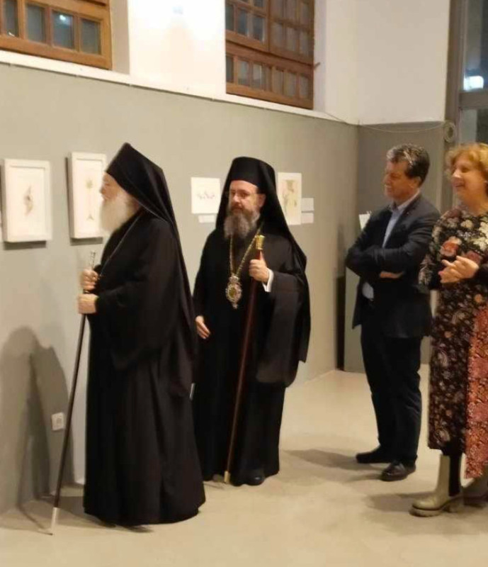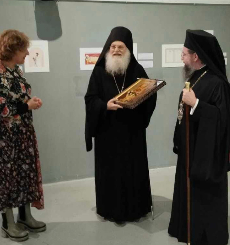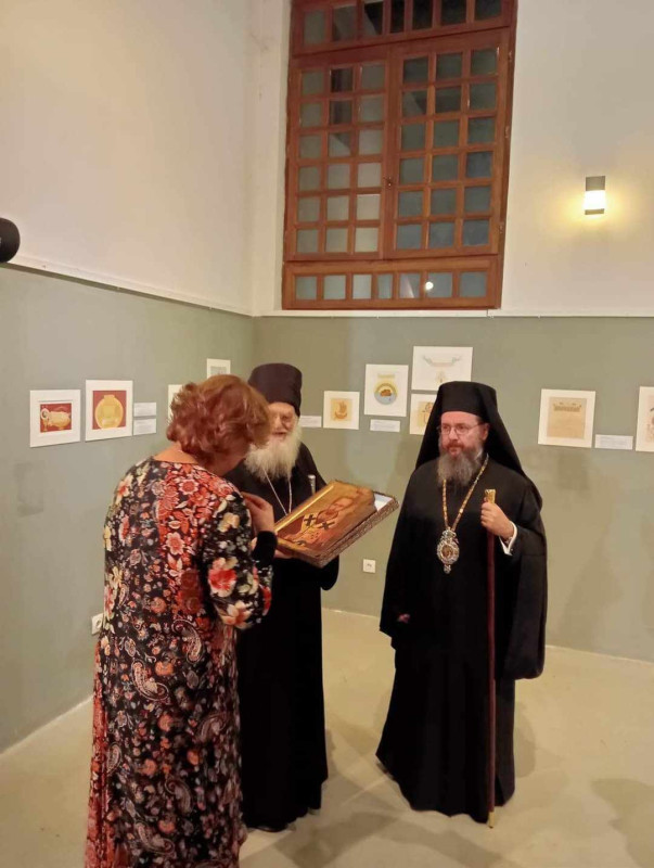 Την Αίθουσα Γλυπτοθήκης της Παλαιάς Δημοτικής Αγοράς Αγρινίου, όπου εκτίθενται έργα ζωγραφικής της κ. Σταυρούλας Κάτσου-Καντάνη και τα οποία κοσμούν το βιβλίο της «Ταξιδεύοντας με έναν Άγγελο στη Θεία Λειτουργία» των Εκδόσεων Μελωδός, επισκέφτηκαν χθες, Σάββατο, 18 Νοεμβρίου, ο Σεβασμιότατος Μητροπολίτης μας Αιτωλίας και Ακαρνανίας κ.κ. Δαμασκηνός και ο Ηγούμενος της Ιεράς Μέγιστης Μονής Βατοπαιδίου του Αγίου Όρους, Γέροντας Εφραίμ.