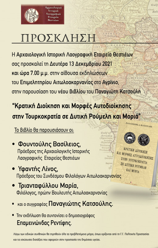 Η Αρχαιολογική Ιστορική Λαογραφική Εταιρεία Θεστιέων σας προσκαλεί τη Δευτέρα, 13 Δεκεμβρίου 2021 και ώρα 7:00 μ.μ. στην αίθουσα εκδηλώσεων του Επιμελητηρίου Αιτωλοακαρνανίας στο Αγρίνιο, στην παρουσίαση του νέου βιβλίου του Παναγιώτη Κατσούλη.