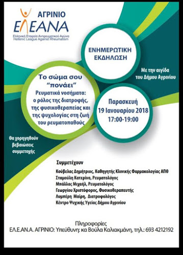 Με κεντρικό μήνυμα …..το σώμα σου «πονάει» ο Σύλλογος ΕΛΕΑΝΑ, διοργανώνει εκδήλωση ενημέρωσης και ευαισθητοποίησης του κοινού με θέμα:«Ρευματικά Νοσήματα: ο ρόλος της διατροφής, της φυσικοθεραπείας και της ψυχολογίας στη ζωή του ρευματοπαθούς», υπό την αιγίδα του Δήμου Αγρινίου.