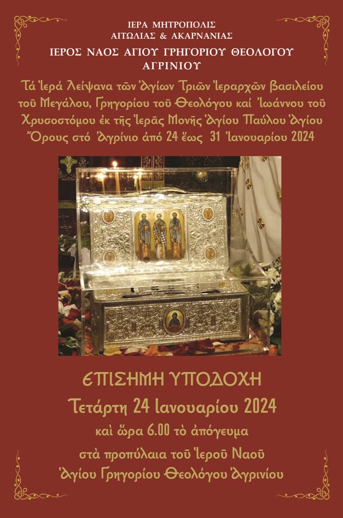 Την Τετάρτη 24 Ἰανουαρίου καί ώρα 6:00’ τό ἀπόγευμα στά προπύλαια τοῦ Ἱεροῦ Ναοῦ Ἁγίου Γρηγορίου Θεολόγου Ἀγρινίου θά πραγματοποιηθεῖ ἡ ἐπίσημη ὑποδοχή τῶν Ἱερῶν Λειψάνων τῶν Ἁγίων Τριῶν Ἱεραρχῶν, Βασιλείου τοῦ Μεγάλου, Γρηγορίου τοῦ Θεολόγου καί Ἰωάννου τοῦ Χρυσοστόμου, ἐκ τῆς Ἱερᾶς Μονῆς Ἁγίου Παύλου Ἁγίου Ὄρους, ἀπό τόν Σεβασμιώτατο Μητροπολίτη Αἰτωλίας καί Ἀκαρνανίας κ. Δαμασκηνό, τόν Ἱερό Κλῆρο, τίς Ἀρχές καί τον πιστό λαό τῆς πόλεως. Τά Χαριτόβρυτα Ἱερά Λείψανα θά κομίσουν Πατέρες τῆς Ἱερᾶς Μονῆς Ἁγίου Παύλου.