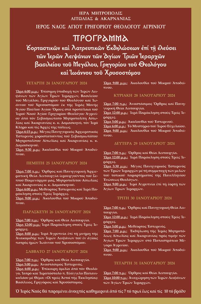 ΠΡΟΓΡΑΜΜΑ ΕΟΡΤΑΣΤΙΚΩΝ ΚΑΙ ΛΑΤΡΕΥΤΙΚΩΝ ΕΚΔΗΛΩΣΕΩΝ ΕΠΙ ΤΗ ΕΛΕΥΣΕΙ ΤΩΝ ΙΕΡΩΝ ΛΕΙΨΑΝΩΝ ΤΩΝ ΑΓΙΩΝ ΤΡΙΩΝ ΙΕΡΑΡΧΩΝ ΒΑΣΙΛΕΙΟΥ ΤΟΥ ΜΕΓΑΛΟΥ, ΓΡΗΓΟΡΙΟΥ ΤΟΥ ΘΕΟΛΟΓΟΥ ΚΑΙ ΙΩΑΝΝΟΥ ΤΟΥ ΧΡΥΣΟΣΤΟΜΟΥ