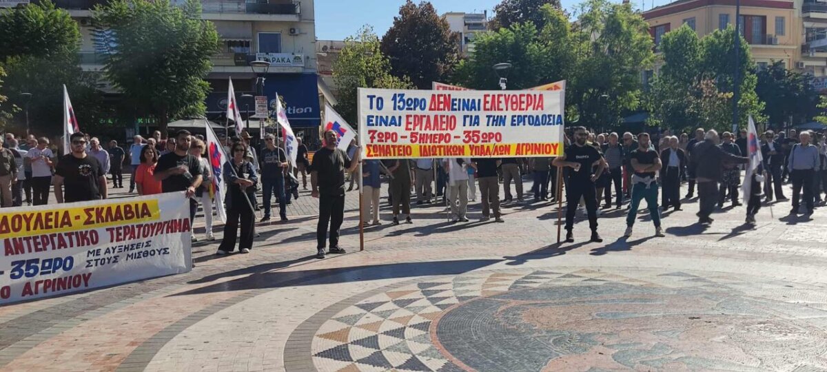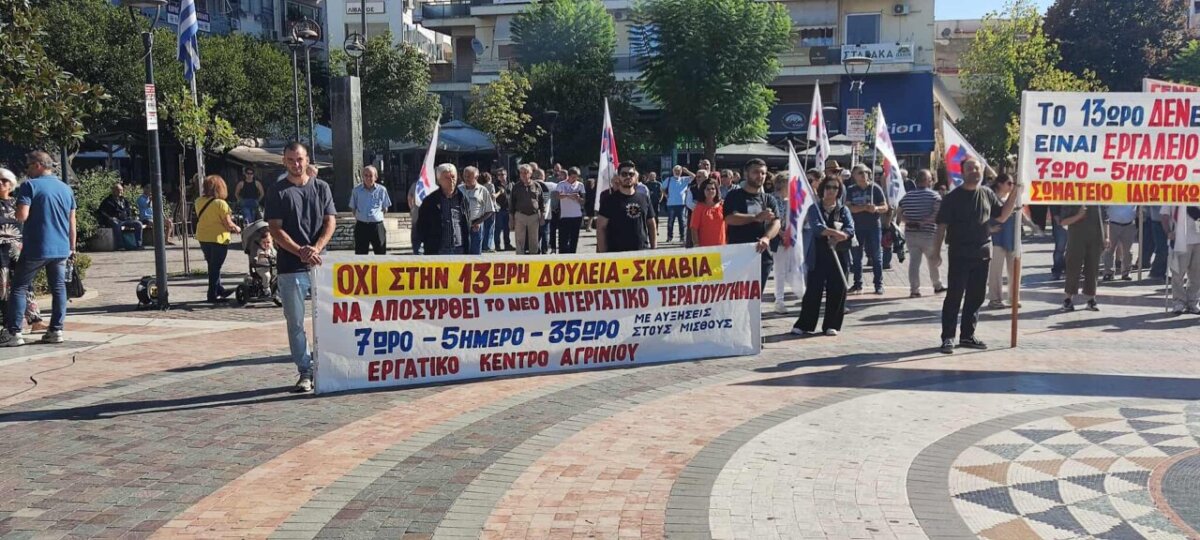 Η συγκέντρωση πραγματοποιήθηκε στις 10:30, μετά από κάλεσμα του Εργατικού Κέντρου Αγρινίου (Ε.Κ.Α.), με συνθήματα και πανό που εξέφραζαν την αντίθεση των συμμετεχόντων στη «νομιμοποίηση της 13ωρης εργασίας και της ευελιξίας», όπως χαρακτηριστικά αναφέρθηκε.