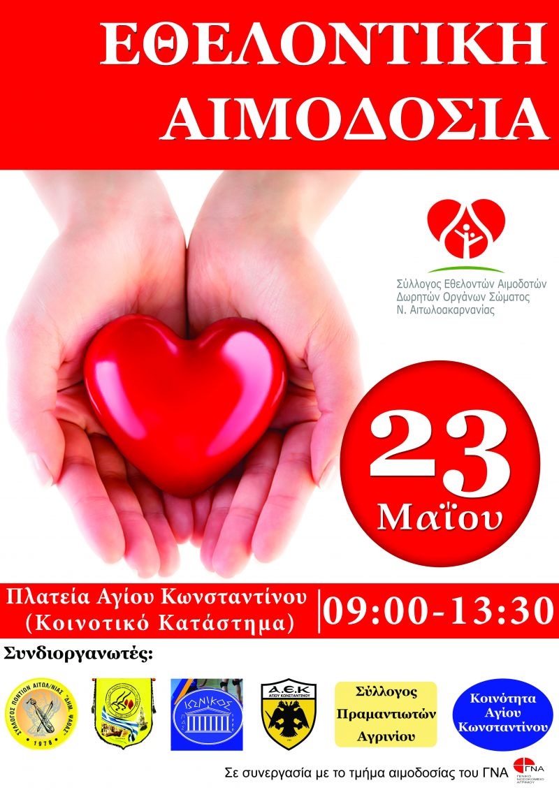 Ο σύλλογος μας σε συνεργασία με τον σύλλογο ποντίων ΔΗΜΗΤΗΣ ΨΑΘΑΣ, τον σύλλογο Μικρασιατών, τον σύλλογο Πραμαντιωτων, τον σύλλογο Α.με.α ΑΠΟΣΤΟΛΟΣ ΛΟΥΚΑΣ, τον αθλητικό σύλλογο ΠΑΣ ΙΩΝΙΚΟ, την Α.Ε.Κ. Άγιου Κωνσταντίνου και την ένωση παλαιμάχων ποδοσφαιριστών σας καλούν στην εθελοντική αιμοδοσία που θα γίνει αύριο ημέρα Σάββατο 23 στην πλατεία του Αγίου Κωνσταντίνου από τις 09:00 το πρωί μέχρι 13:30 το μεσημέρι.