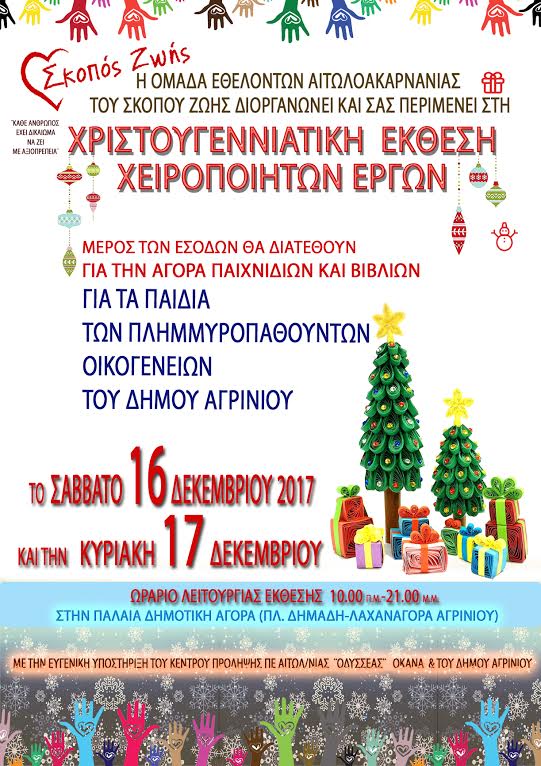 Η ομάδα εθελοντών Αιτωλοακαρνανίας του Σκοπού Ζωής, διοργανώνει εκτάκτως για 2 ημέρες Χριστουγεννιάτικη έκθεση φιλανθρωπικού χαρακτήρα στην Παλαιά Δημοτική Αγορά (πλατεία Δημάδη) με την ευγενική υποστήριξη του κέντρου πρόληψης Π.Ε. Αιτωλ/νίας ¨ΟΔΥΣΣΕΑΣ¨ ΟΚΑΝΑ και του δήμου Αγρινίου.