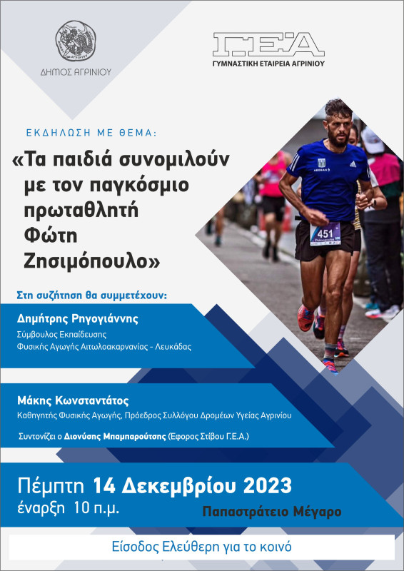 Ο Δήμος Αγρινίου και η Γυμναστική Εταιρεία Αγρινίου διοργανώνουν, την Πέμπτη, 14 Δεκεμβρίου στο Παπαστράτειο Μέγαρο στις 10 π.μ., εκδήλωση με θέμα: «Τα παιδιά συνομιλούν με τον Παγκόσμιο Πρωταθλητή Φώτη Ζησιμόπουλο».