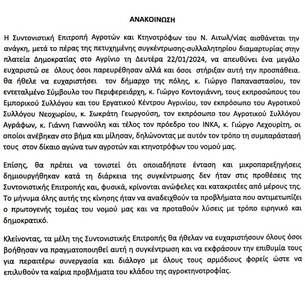 Όλους όσοι παραβρέθηκαν στην επιτυχημένη συγκέντρωση στο Αγρίνιο, εξέφρασαν τη συμπαράσταση τους και υποστήριξαν τα αιτήματά τους, ευχαριστεί με ανακοίνωσή της η Συντονιστική Επιτροπή Αγροτών και Κτηνοτρόφων Αιτωλοακαρνανίας.