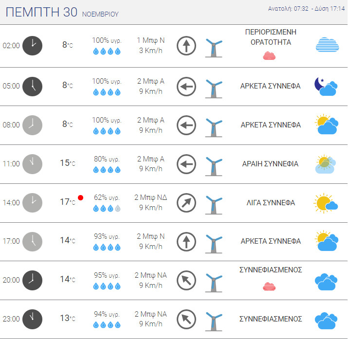 Για την Πέμπτη, 30 Νοεμβρίου 2023 προβλέπεται ηλιοφάνεια με λίγες νεφώσεις παροδικά αυξημένες, με τοπικές βροχές στο Βόρειο Ιόνιο, στην Ήπειρο και πιθανόν στις Κυκλάδες και τοπικές καταιγίδες στο Ανατολικό Αιγαίο και στα Δωδεκάνησα.