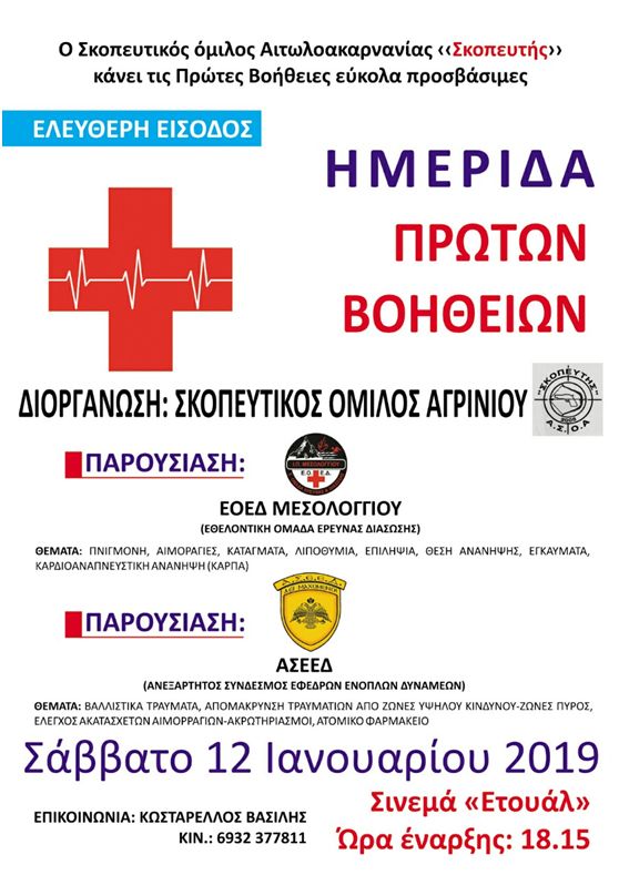 O Σκοπευτικός Όμιλος Αιτωλοακαρνανίας «Σκοπευτής» κάνει τις Πρώτες Βοήθειες εύκολα προσβάσιμες. Ημερίδα Πρώτων Βοηθειών με την είσοδο ελεύθερη.