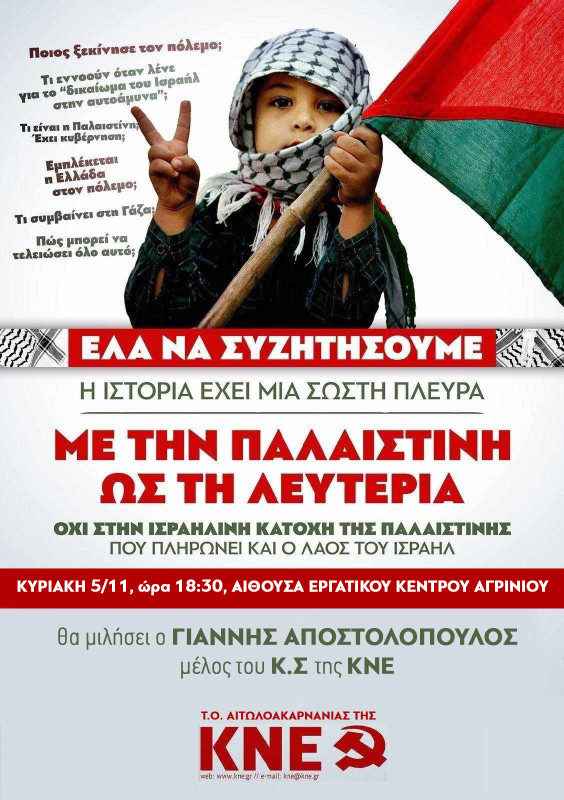 Η Τ.Ο. Αιτωλοακαρνανίας της Κ.Ν.Ε. με αφορμή τις εξελίξεις στη Παλαιστίνη και στην ευρύτερη περιοχή, διοργανώνει εκδήλωση-συζήτηση με θέμα «Η ιστορία έχει μία σωστή πλευρά, με τη Παλαιστίνη ως τη λευτεριά», τη Κυριακή 5 Νοεμβρίου 2023 στις 18:30, στην αίθουσα του Εργατικού Κέντρου Αγρινίου.