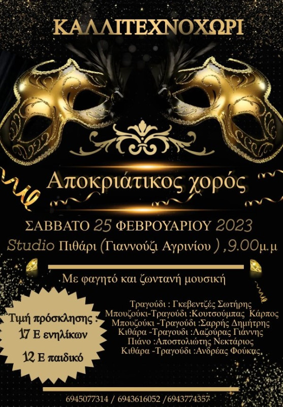 Το Καλλιτεχνοχώρι σας προσκαλεί στον Αποκριάτικο Χορό που θα πραγματοποιηθεί στις 25 Φεβρουαρίου 2023 και ώρα 9 μ. μ. στο Studio Πιθάρι (Γιαννούζι Αγρινίου).