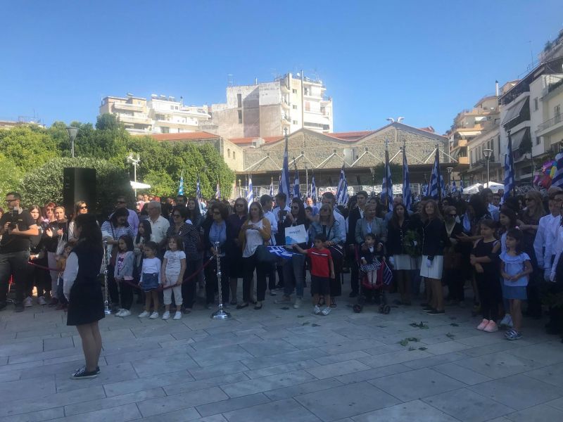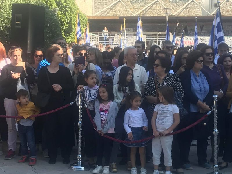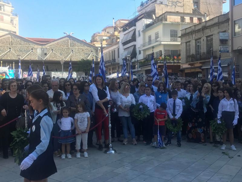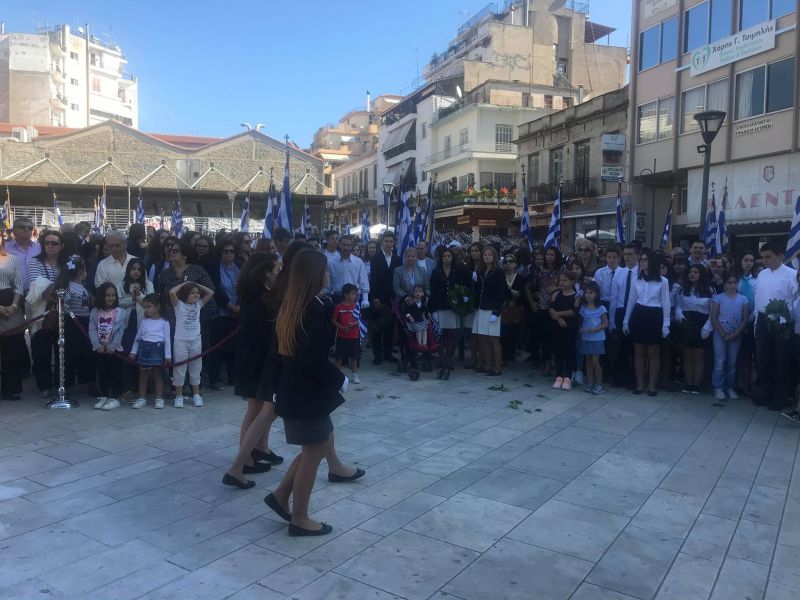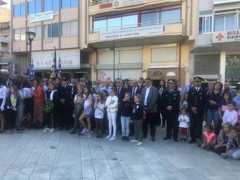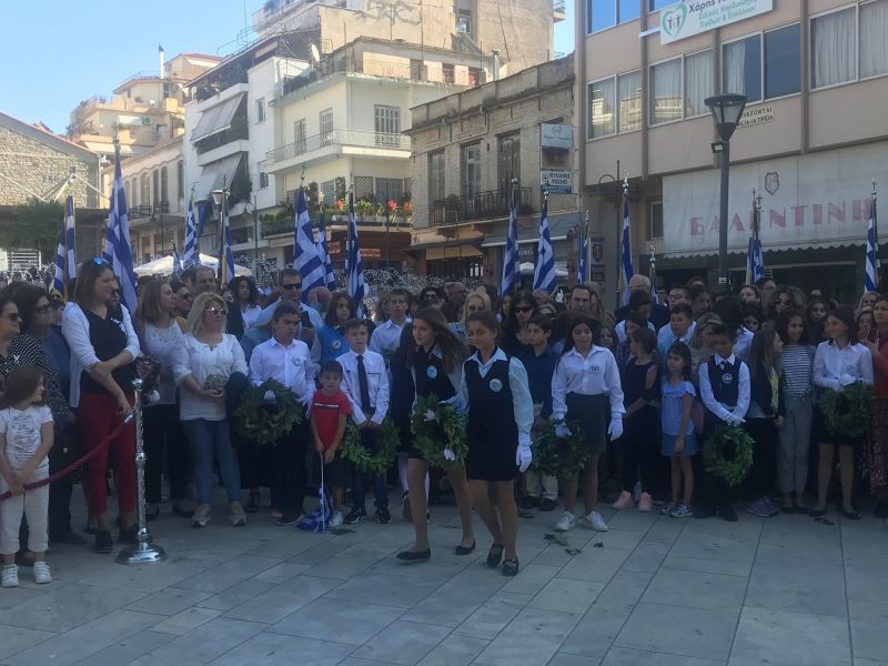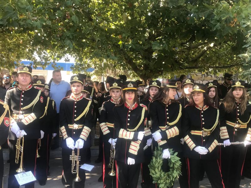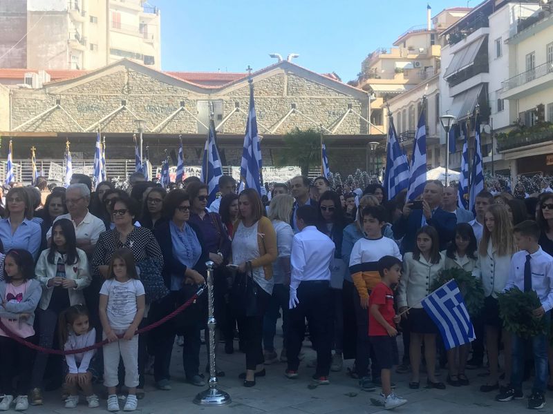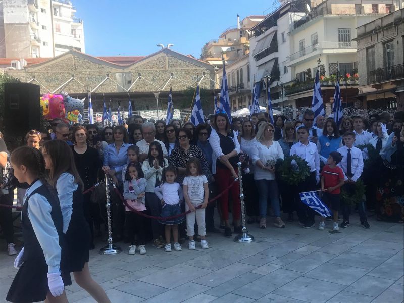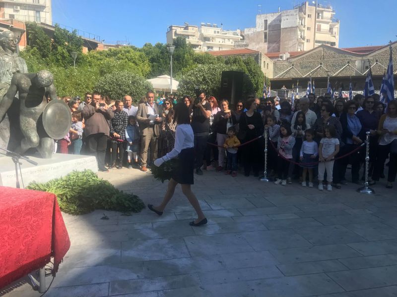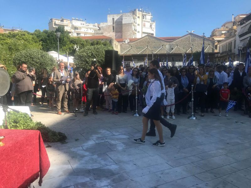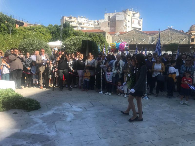Στις 11:55 είχαμε προσέλευση επισήμων και σχολείων στο μνημείο των Πεσόντων στην Πλατεία Μαρίας Δημάδη, όπου πραγματοποιήθηκε επιμνημόσυνη δέηση & κατάθεση στεφάνων από φοιτητές των Πανεπιστημιακών Τμημάτων, μαθητές των Σχολείων Α/θμιας και Β/θμιας Εκπαίδευσης, τη Σχολή Αδελφών Νοσοκόμων, κλπ.