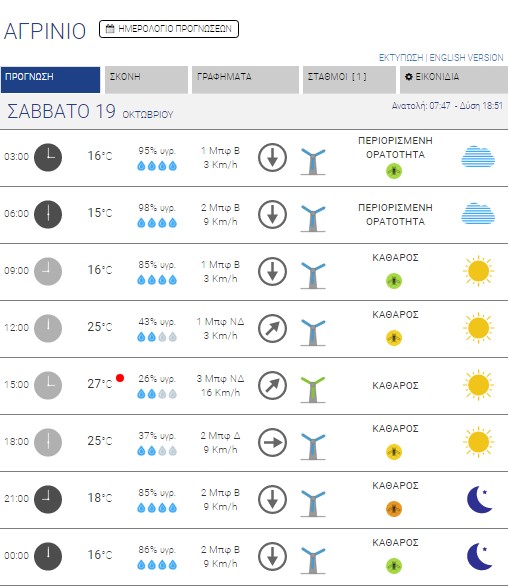 Το Σάββατο 19 Οκτωβρίου 2019 αναμένονται αραιές νεφώσεις που κατά τόπους θα είναι πυκνότερες στο Αιγαίο και την Κρήτη, και κατά τις μεσημβρινές και απογευματινές ώρες και στα ηπειρωτικά.