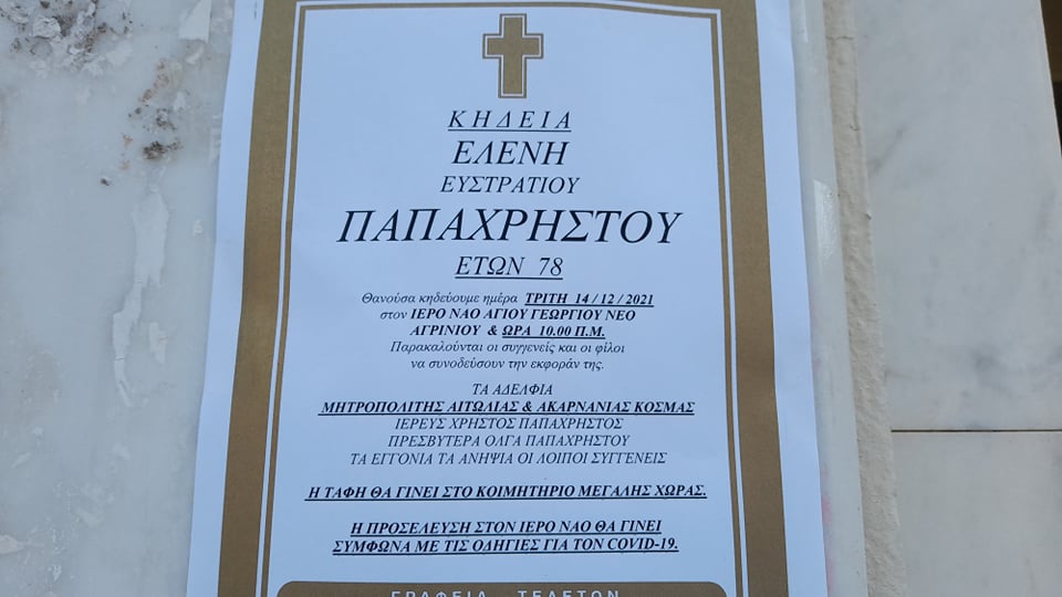 Σε κλίμα βαθιάς συγκίνησης αυτή την ώρα τελείται στον Ιερό Ναό Αγίου Γεωργίου, στο Αγρίνιο, η νεκρώσιμη ακολουθία της Ελένης Παπαχρήστου του Ευστρατίου, αδερφής του Μητροπολίτη Αιτωλίας και Ακαρνανίας Κοσμά που «έφυγε» από τη ζωή σε ηλικία 78 ετών από κορωνοϊό.